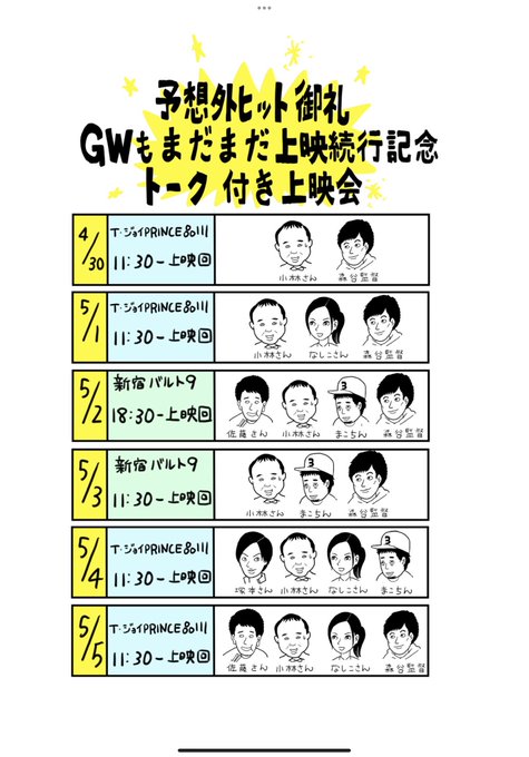 ゴールデンウィークに 【予想外ヒット御礼&ゴールデンウィークもまだまだ上映続行記念トーク付き上映会】 が決定しました! こちら登壇予定のスケジュール表つくってみました 詳細は公式SNS、公式ページをご確認下さい! 似顔絵似てなくてすいません! the3yougmen.tumblr.com #the3名様