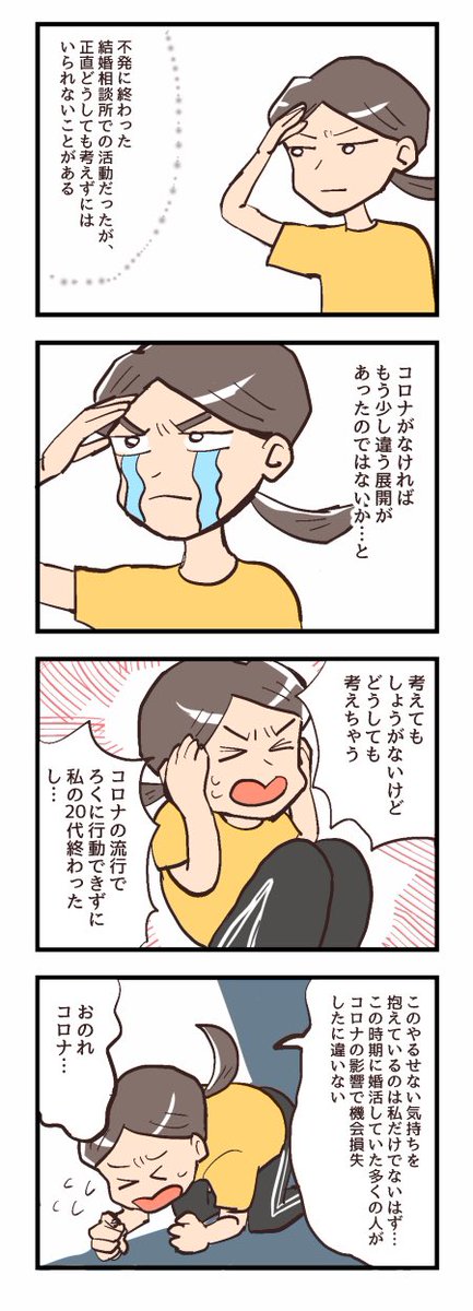 コロナのせいで色んな人が迷惑被ったわけだけど、婚活してた人も打撃大きかったよね。コロナ許せないよね。 皆さんの気持ちを込めて殴っておきました。 #漫画が読めるハッシュタグ #婚活 #エッセイ漫画 #アラサー女子 #コロナ許さん #ジョジョパロ