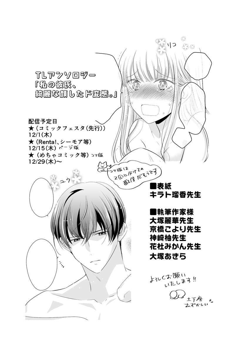 TLアンソロジー『私の彼氏、綺麗な顔したド変態。』 8ページ読み切り描かせていただきました✨ よろしくお願い致します✨ ■ 配信予定日: ・ページ版(コミックフェスタ先行)2022年12月1日(木) ・(Renta!、シーモア等)2022年12月15日(木) ・コマ版(めちゃコミック等) →2022年12月29日(木)