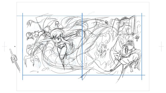 18 42 ドリームハンター麗夢CDドラマ「残夢の白百合」のブックレットに描かせていただいたイラストの下描き(左)と「マンガ形式にしてはどうか?」てお話があった時のネーム(右)です。レムちゃんの剣、好き!✨🗡️ 23/03/02 20:48