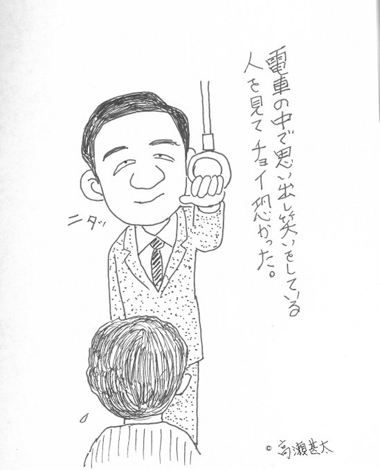 思い出し笑いを止めるのは難しいですね。 #高瀬甚太のイラスト #おじさん #電車 #思い出し笑い #イラスト #イラストグラム #手描きイラスト #train #smileatthememory #takasejinta #illustration #ballpointpen