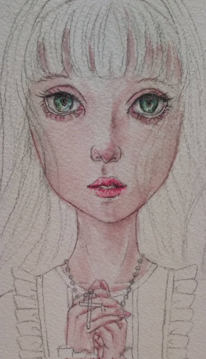 gallery Sorath『幻麗少女経典拾弐』 3/21(火)~3/26(日) @SawsinSchwarze 水彩画制作中です🎨🖌️ 「痛~い😿」 #wip #watercolorpainting