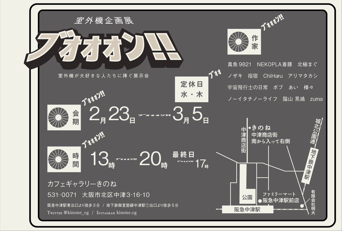 室外機テーマの企画展 「ブオオオン!!」出展のお知らせ。 信じられないことなんですけども、あるんですな、そういうテーマの企画展が!😆 カフェギャラリーきのね様 @kinone_cg にて、 2/23~3/5 開催!ぜひご覧あれ!