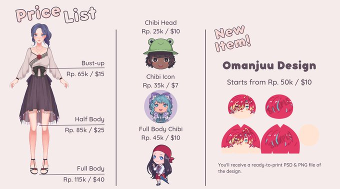 comms pricelist update✨ i'm now opening commissions for omanjuu designing! i also added new payment method – now you can pay through Ko-fi donations! don't hesitate to contact me if you have any inquiries :D more info: maqaroneecomms.carrd.co #artidn #zonakaryaid