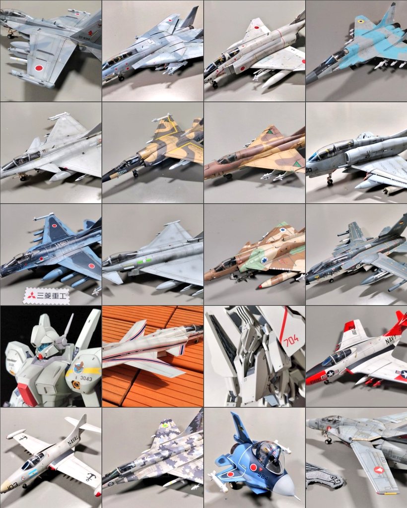 #今年作ったプラモ晒そうぜ H社EA-18G FM社F-14JA FM社F-4JA(M) Z社MiG-29 9.13 HB社Rafale M SH社Mirage F.1EQ F社MiG-21MF F社OA-4M FM社F-2A H社Eurofighter AMK社Kfir C7 H社Tornado IDS B社JEGAN H社X-29A 壽屋継守 H社F9F-8 H社F9F-2 Z社MiG-29 9.13 H社たまごF-2 PM社VF-1S 20個作りました。