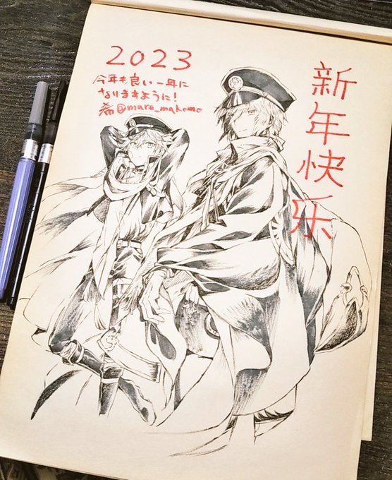 2023年筆ペンで描き初め! 昨年はしょくもで色々なご縁をいただきましてありがとうございました。今年もたくさん絵を描けるといいなあ #食物語_rkgk
