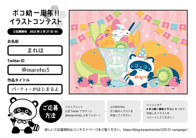 ポコ助さん一周年おめでとうございます!🎉 一周年記念パーティーでみんなで食べるパフェを作っているポコ助さんをイメージして描きました。 これからも応援しています! @bestprintsbiz_d #ポコ助一周年イラコン