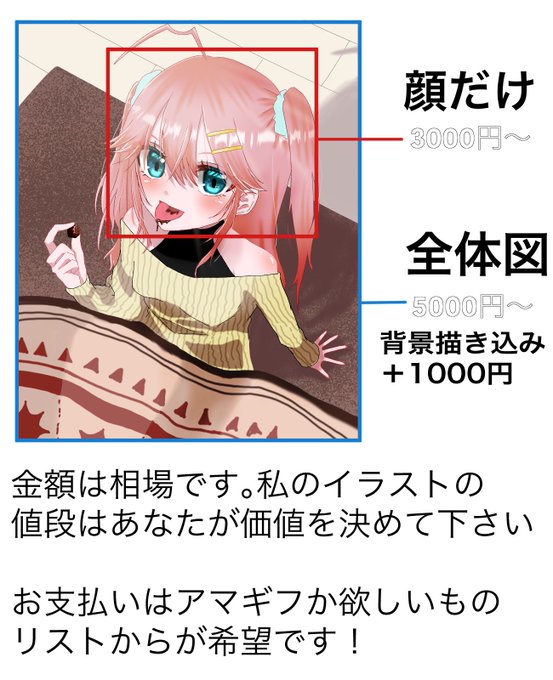 わたしの依頼料金が分かりづらいと思うので決めてみました 顔だけの場合は3000円から〜 全体は5000円から〜 相場なだけなので、学生さんなら安くするし、もっと払いたいと思った方はあなたの思うお値段をお支払い下さい! 動画作成も可 #有償依頼募集 #有償依頼 #イラスト依頼 #イラスト #Vtuber