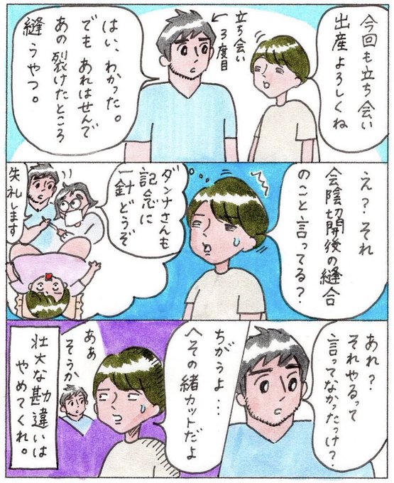 助産師さんのすすめもあって『へその緒カット』を夫に初体験してもらおうと思い、数ヶ月前に話しておいたのに、なにをどう勘違いしたのか会陰切開後の縫合をさせられると思っていたようだ。医者かよ! #会陰切開
