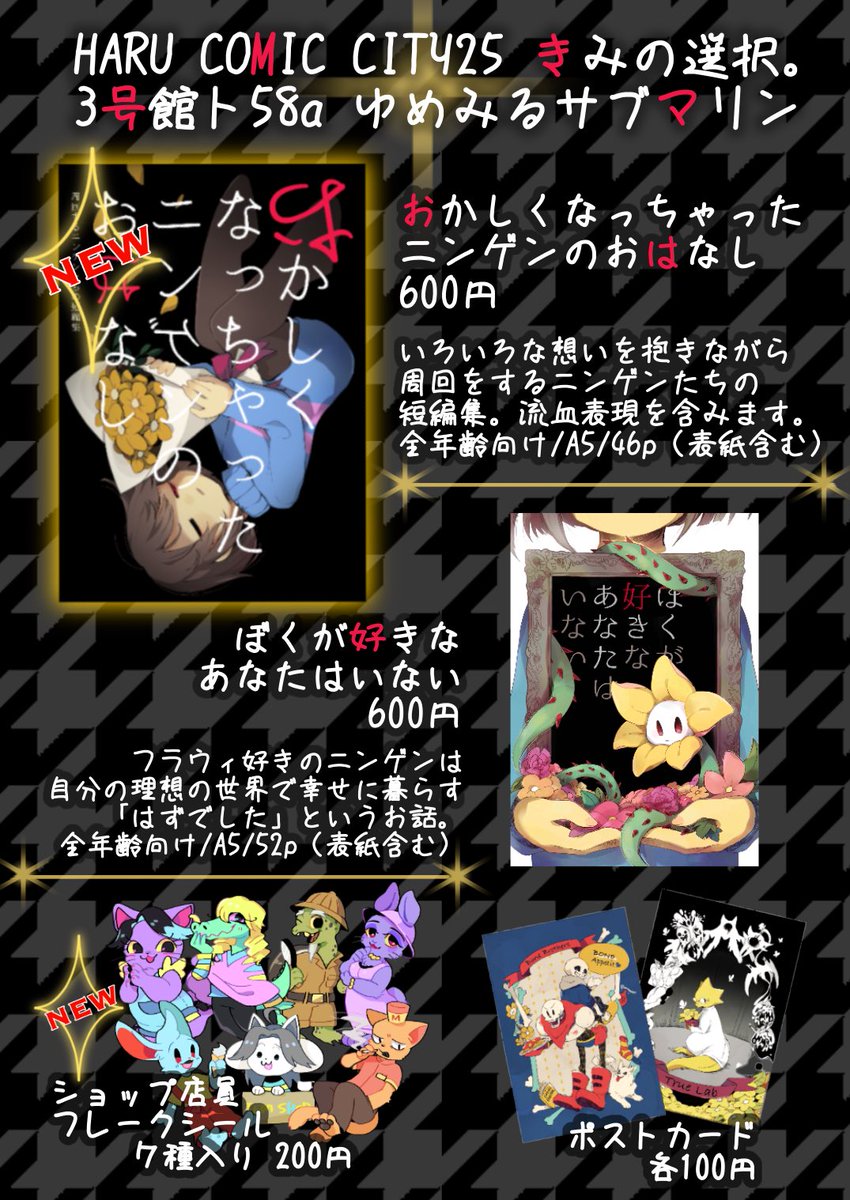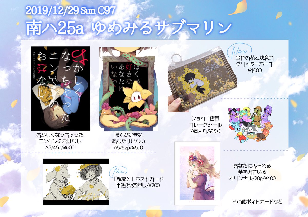 C97 冬コミお品書き作りました!!えら〜〜〜い!!!【ゆめみるサブマリン】が出るのは2日目日曜日、南ハ25aでーす!! 新刊はありません!!新グッズはあります!!デルタ新刊なくなった結果ニンゲンだらけになりましたヨロシク!!!