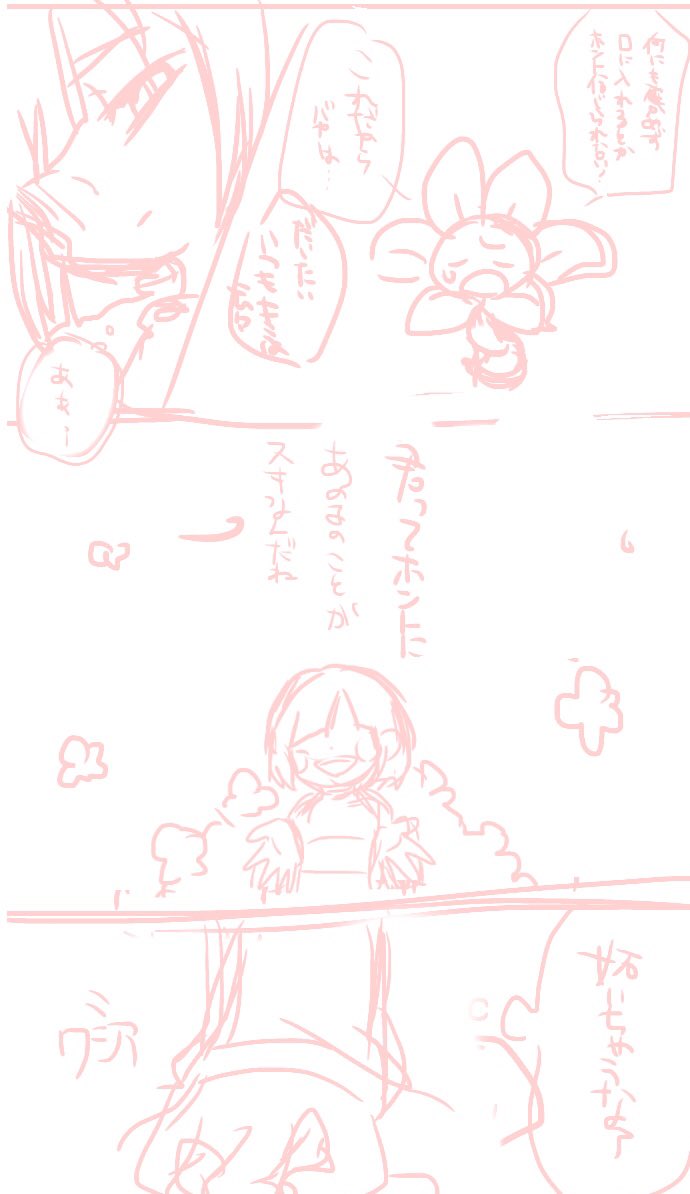 0 10 最近お絵かきしてないけど 何か代わりに上げられるものないかな〜と過去絵漁ってたら フラウィちゃん大好きニンゲンがゴールデンフラワーを食べてそれをフラウィに止められる漫画のラフ(途中抜けしており未完成)が出てきた 19/01/23 18:45
