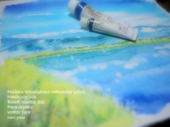 よくある安曇野の風景に、どうオリジナリティを盛り込めるか挑戦♪まぁいつもの私の絵だけれど…山を描くのにマリンブルーが役立つとはこれいかに…♪ #ホルベイン #透明水彩 #Watercolor #水彩絵を流して水彩民を増やそう #画材研究タグ #ウォーターフォード #風景画 #背景