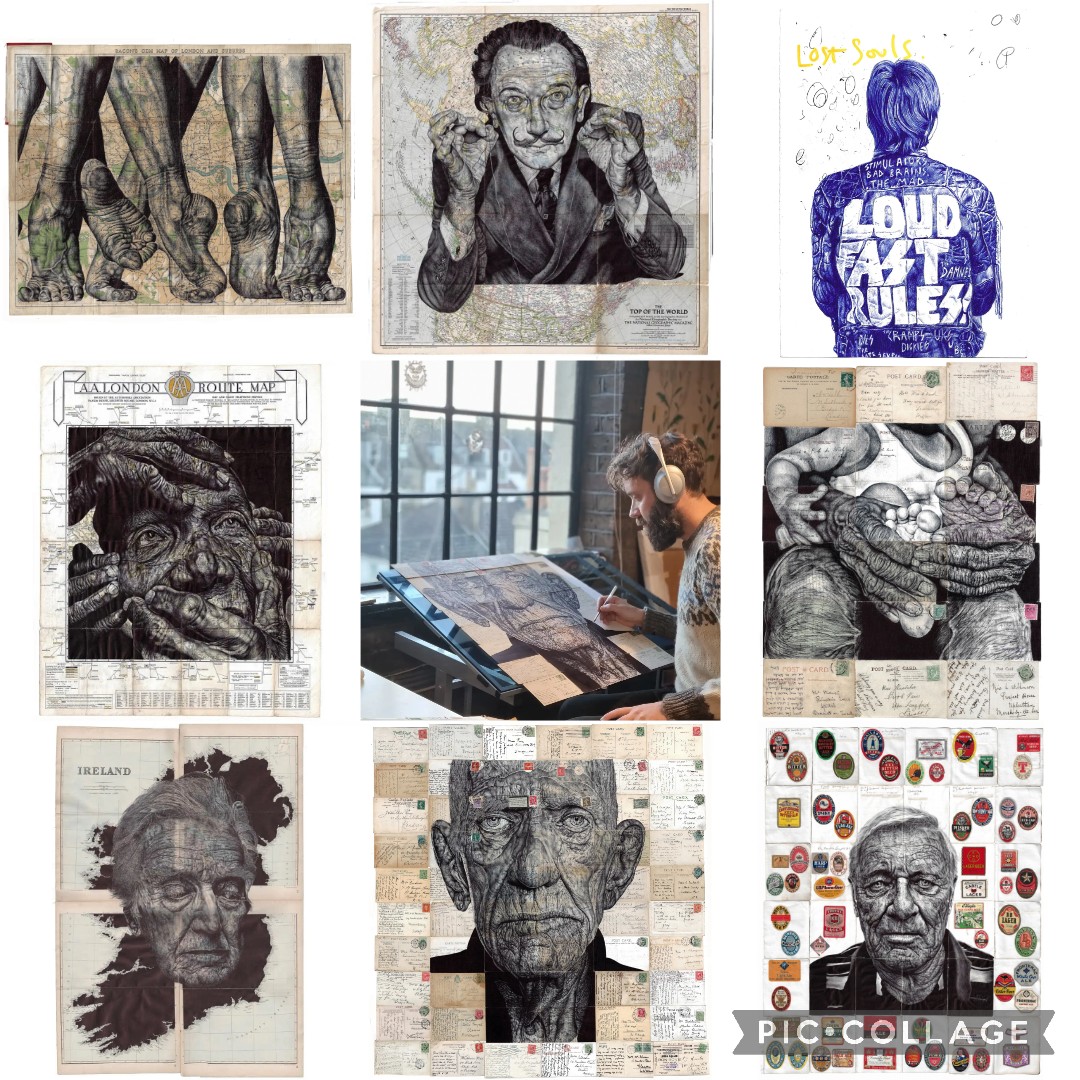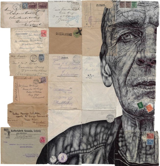 'words lost in high winds' Ballpoint pen drawing on antique postcards. Coming to @hangupgallery soon. . #art #illustration #penandink #pensketch #penportrait #ballpointpen #ballpointpenart #wip #bicpen #artistsofinstagram #studio #markpowell #markpowella… instagr.am/p/CUzhU7zg9Ml/