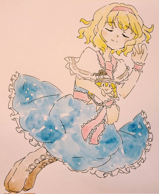 おひるねアリス(* ̄ω ̄)ф… #深夜の真剣お絵描き60分一本勝負 #東方Project #アリス・マーガトロイド #アナログイラスト #透明水彩 #色鉛筆 #東方絵描きさんと繋がりたい