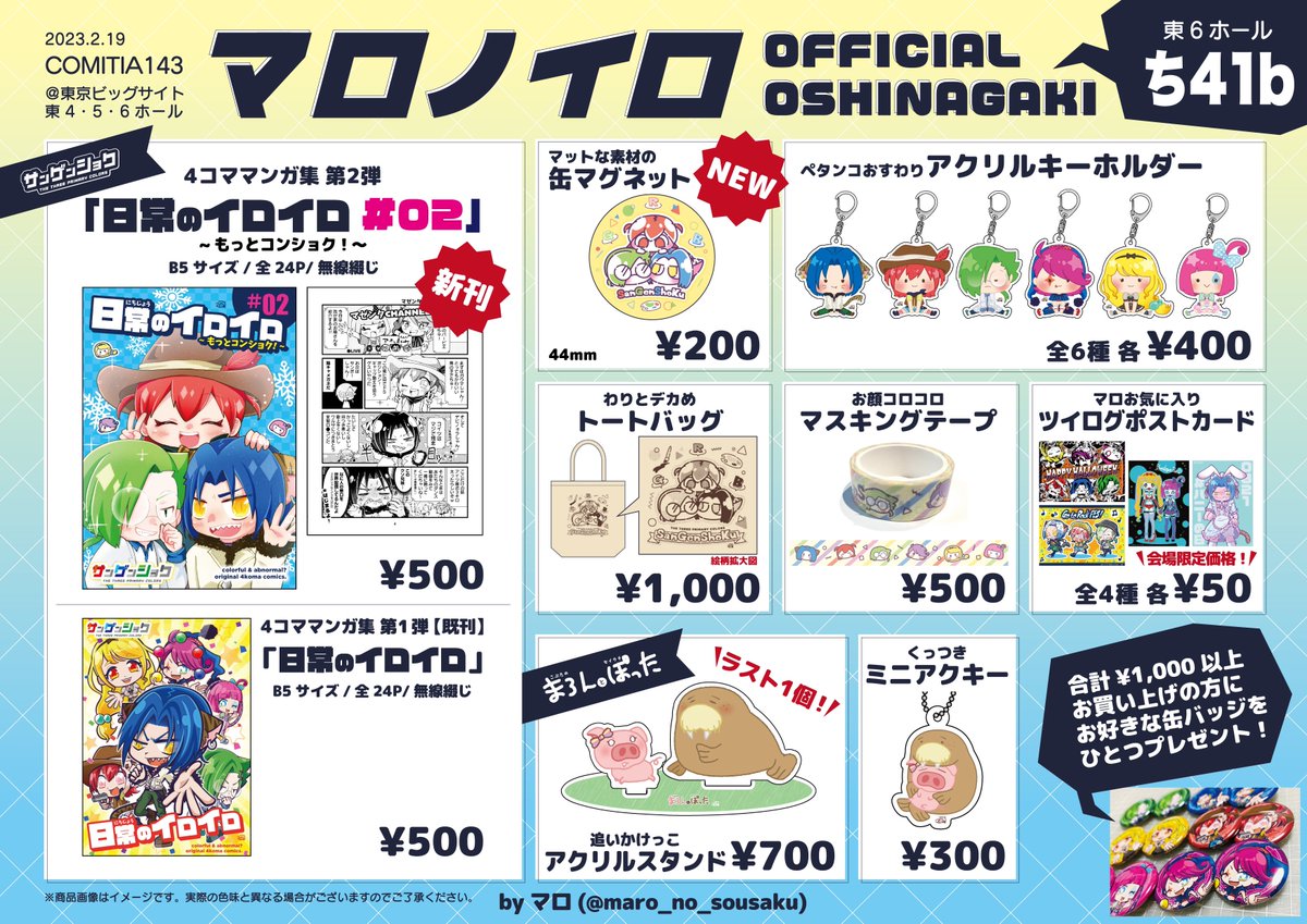 2月19日(日)に東京ビッグサイトで開催されるコミティア143のお品書きです✨ 🔶サークル名: マロノイロ 🔶スペース: ち41b 4コママンガ集の新刊と新しいグッズの缶マグネットあります🎉 お知り合いの方も初めましての方も気軽にお立ち寄りくださいませ☺️ #COMITIA143 #コミティア143