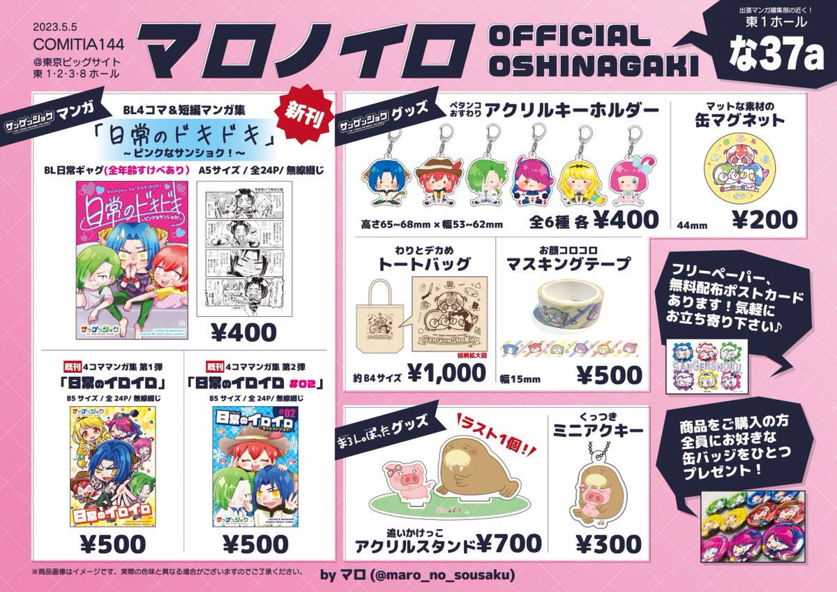 5/5(金祝)に東京ビッグサイトで開催されるCOMITIA144のお品書きです✨ 🔶サークル名: マロノイロ 🔶スペース: な37a 新刊はドキドキのBL本です! グッズだけの購入も大歓迎🙌!! フリーペーパーや無配ポストカードもあります! ぜひ気軽にお立ち寄りくださいませ☺️ #COMITIA144 #コミティア144