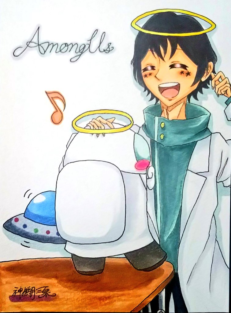 たけぉさん描きました! たけぉさんとゲスペンどっち主体で描くかめちゃくちゃ悩んでこうなりましたw(アマアスのキャラクターとゲスペンのフォルムが似通っちゃうので) ゲスペンに癒される日々 ∧( 'Θ' )∧ #たけぉ #たけぉぇかき #AmongUsFanArt