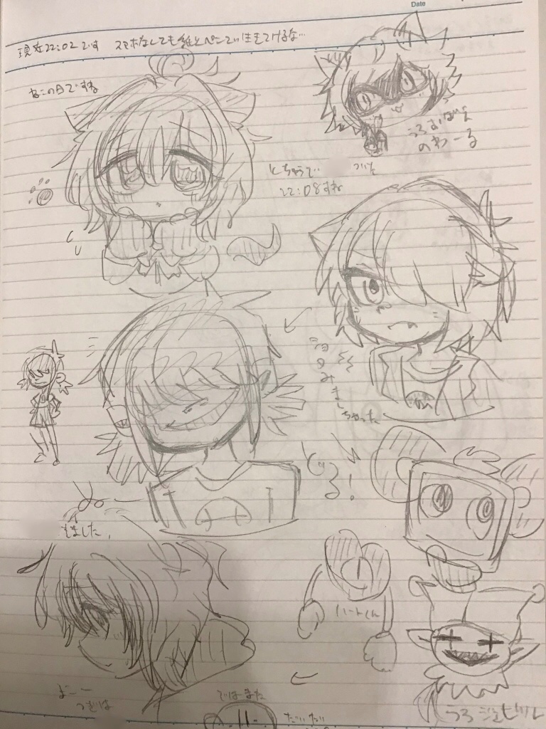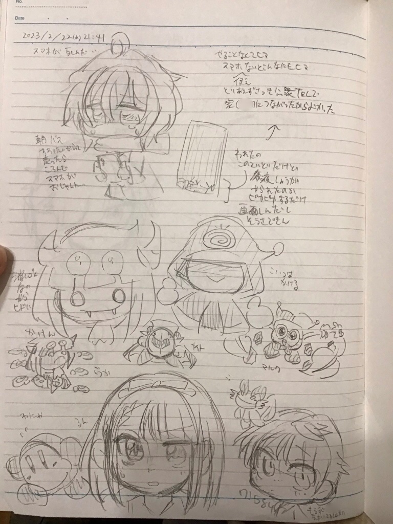 3 4 帰り暇すぎてノートにらくがきしていた 一発描きだと中高時代の自由帳みがすごい 23/02/22 23:40