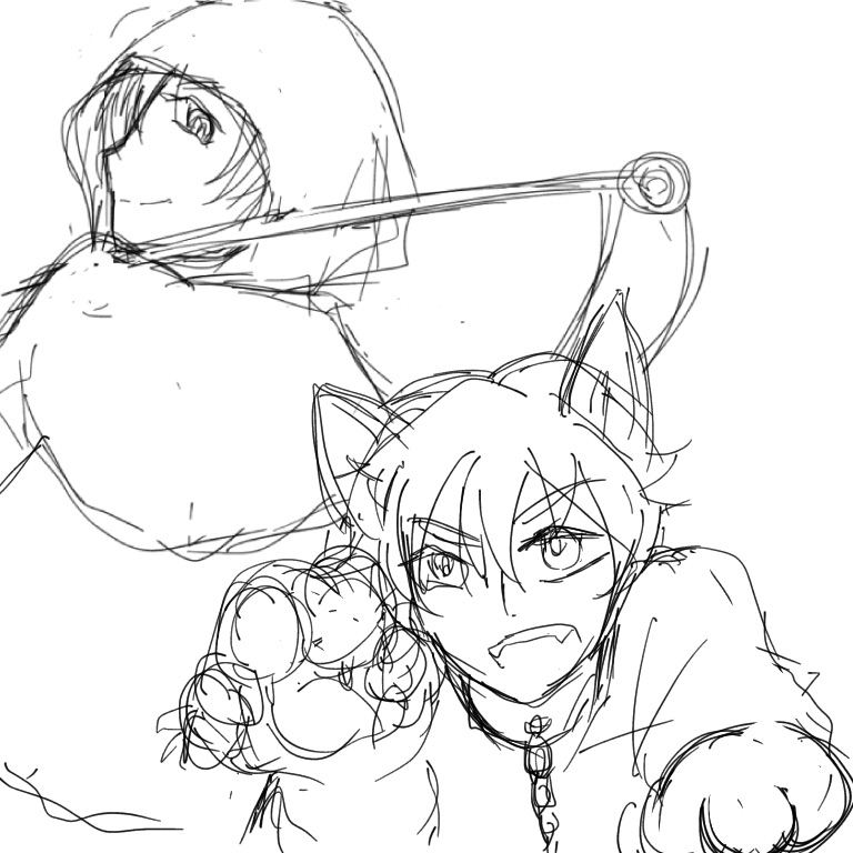 前描いた落書きの続き的な。 フォロワっさんと話してて、こうだと可愛いなーってやつ。 ヘイシュウにヤキモチ妬いてたら、後で師匠にお膝の上で撫でてもらえるよって。 嬉しい時は尻尾が出るとかだとなお可愛いな