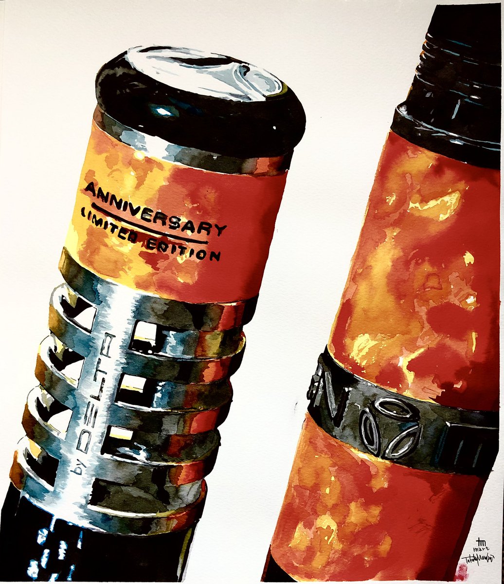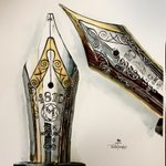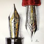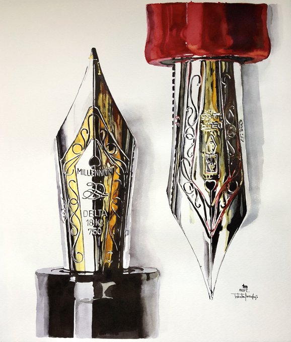 これが一番頑張ったかな。 お互いに写り込み合うペン先の光沢感を、万年筆インクを混色せずに描きました(描いた先で混ざっちゃってるけど)。 黄色っぽいところで5色、赤っぽいところは4色使ってます。 インクの色を把握するのが1番大変かも😂 #過去作で自分が最高だと思う絵を1枚載せて5000rtを目指せ