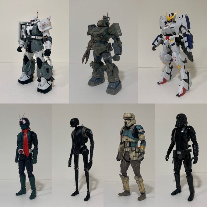 #今月作ったプラモ晒そうぜ 2023年3月。 ①RGエリックマンスフィールドザク ②Get truth版 ダグラム ③バルバトス第6形態 ④シン・仮面ライダー ⑤K-2SO ⑥ショアトルーパー ⑦デストルーパー