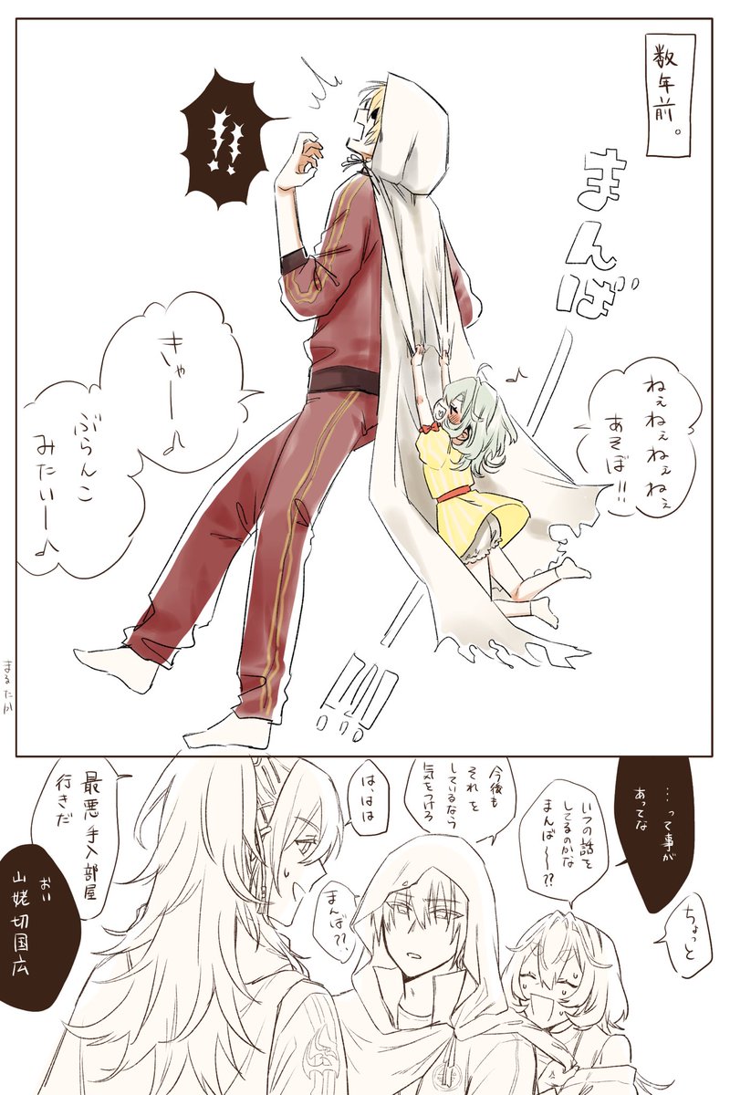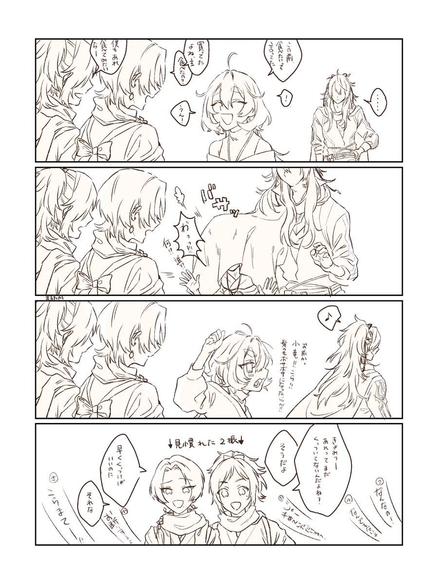 41 141 小竜さに / こりゅさに(※顔あり) 楽しそうに話してる審神者にちょっかいかける小竜🐉 と巻き込まれ慣れたあんみつ 22/06/15 23:44