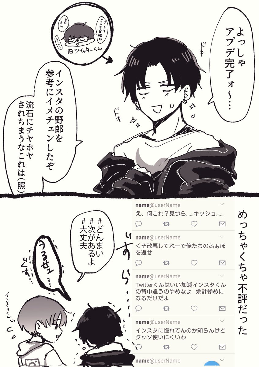 昔描いたインスタに憧れてオシャレアプデをしてみたけどユーザーに大不評食らって落ち込むツイッターくん再掲しとくね
