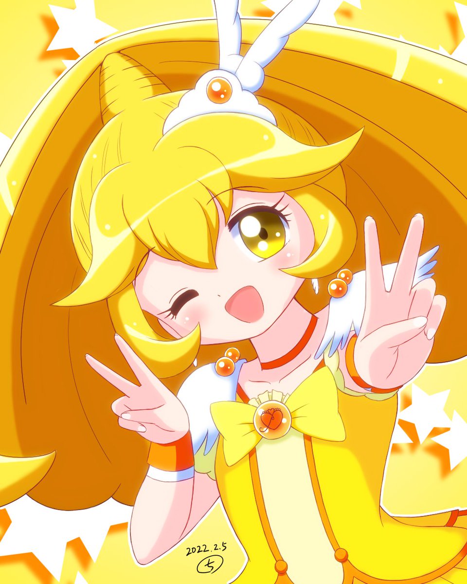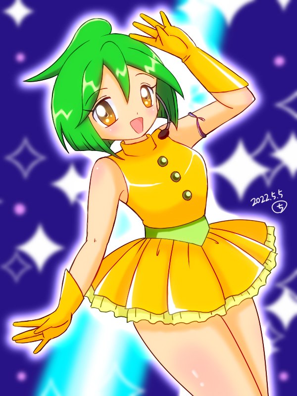 今年も描いたー。今回はゆりと対になるステージ衣装で。ひなぎく、お誕生日おめでとう!左右のグローブの長さが、ゆりと左右逆なのがポイント。 #ウェディングピーチ #珠野ひなぎく生誕祭2022 #珠野ひなぎく誕生祭2022 #エンジェルデイジー生誕祭2022 #エンジェルデイジー誕生祭2022