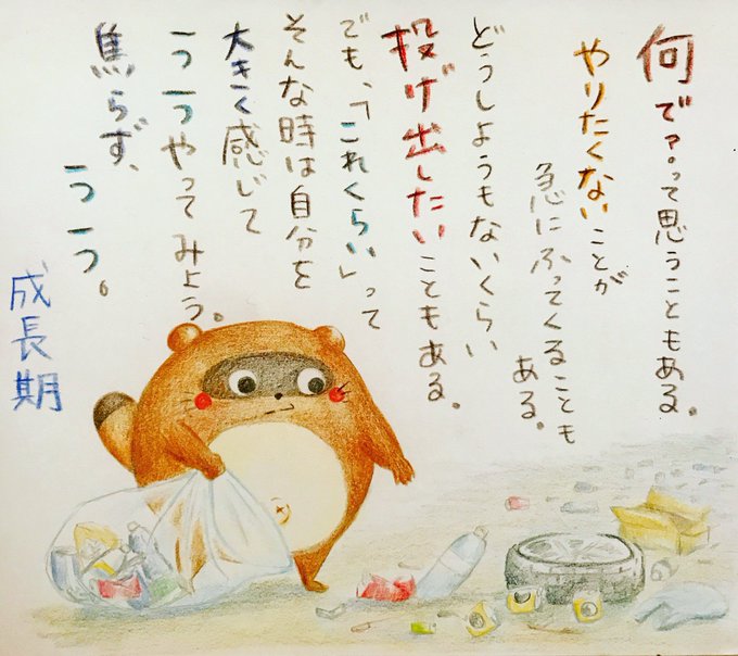 心もからだもまるい世界のお話 まるい日々の詩-成長期- もちろん逃げてもいいし、 心と身体の健康が一番大事。 その上で、何かに立ち向かうと選択したときは、 肩の力は少し緩めながら、 一つ一つって気持ちで片付けていこう。 #色鉛筆 #イラスト好きな人と繋がりたい #詩