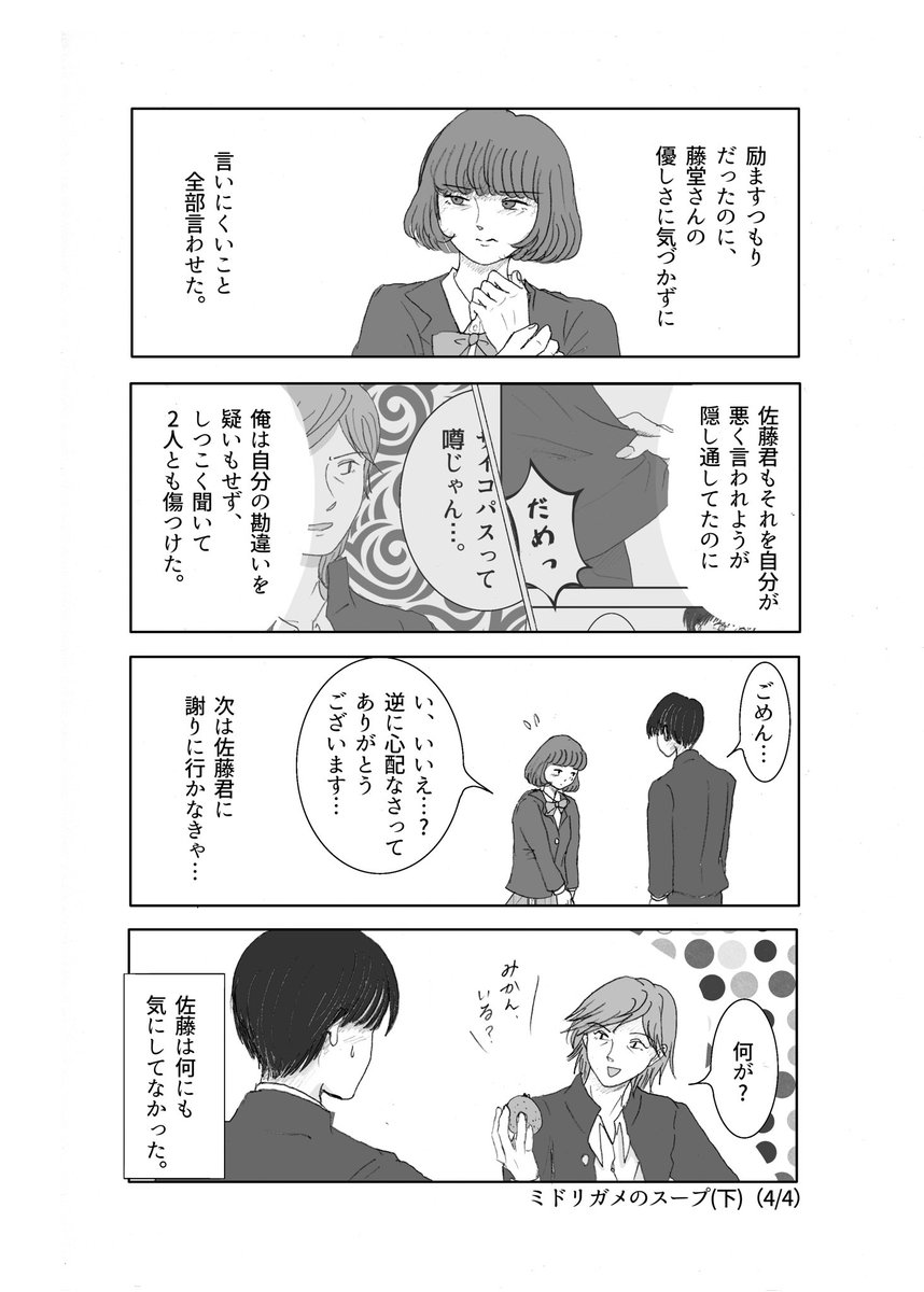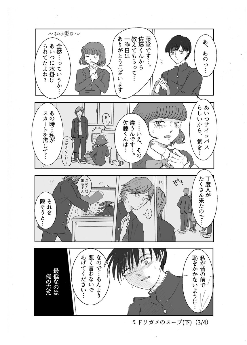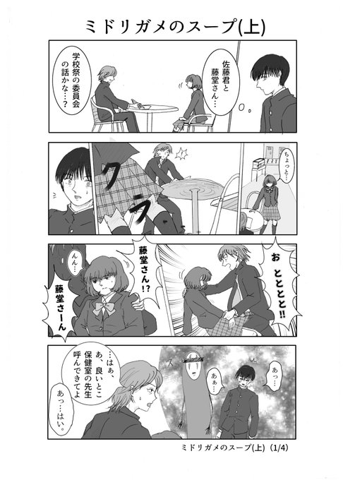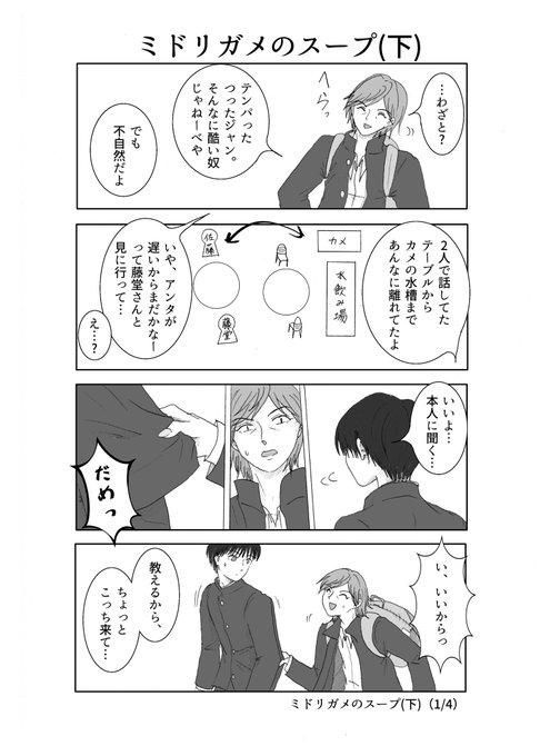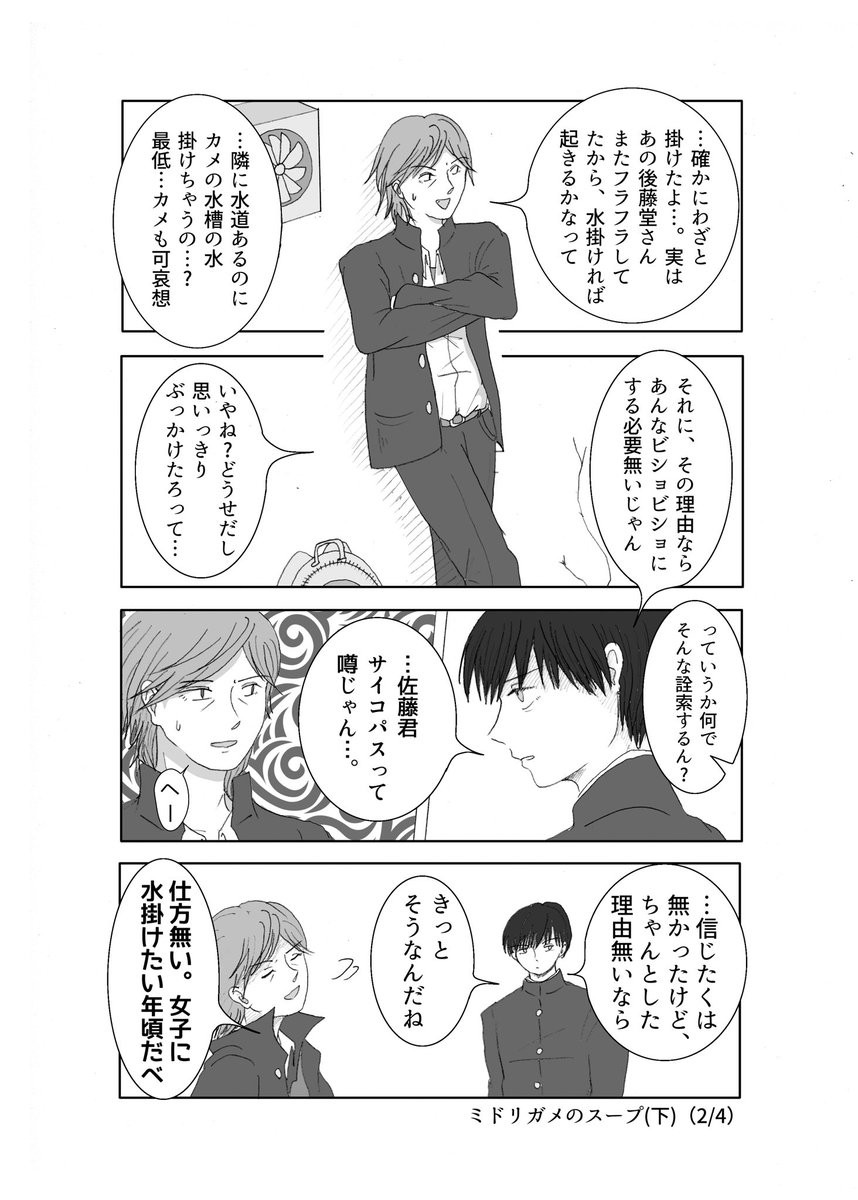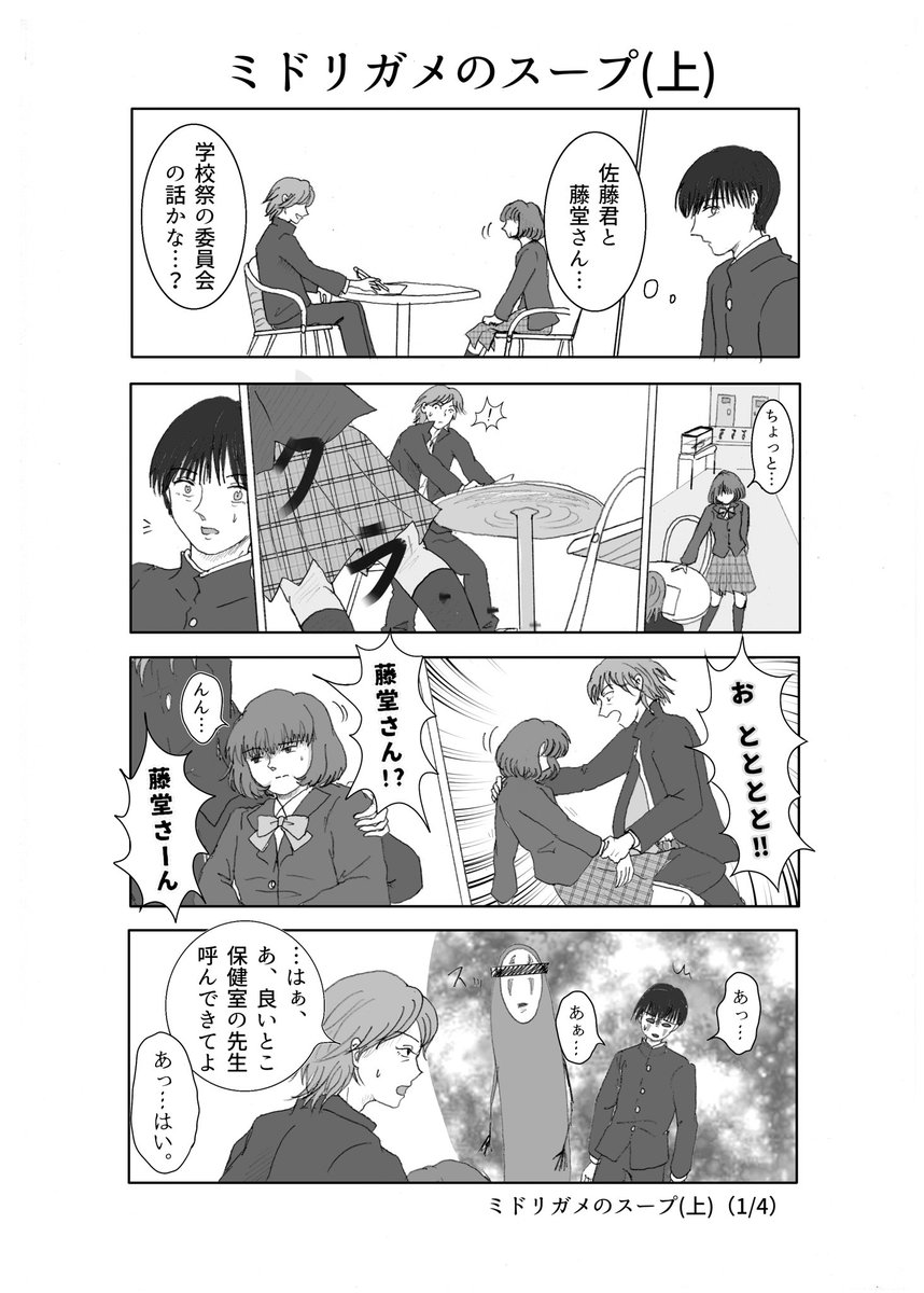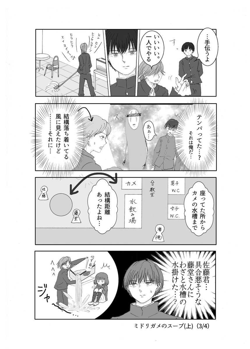 「ミドリガメのスープ(上)」 #漫画が読めるハッシュタグ 2人で話している最中、女子高生が倒れてしまった。そこで、男子校生は彼女にカメの水槽の水を掛けた。後日、女子高生は男子校生に感謝した。なぜ? っていう水平思考クイズみたいな漫画🐢