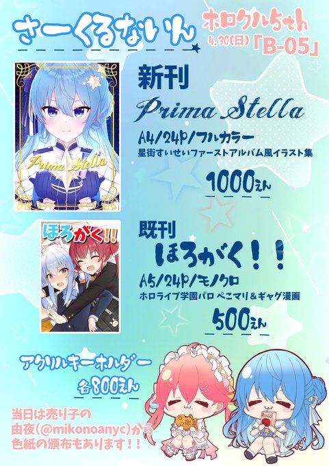 4/30(日)ホロクル5thのお品書きです! すいちゃんイラスト集 既刊の学パロ漫画 みこめっとアクキー しゃかしゃかキーホルダー 色紙(売り子さん作) で行きます!୧( "̮ )୨✨ 売り子にすいちゃんコスで由夜(@mikonoanyc )が居るので見に来てにぇ〜!! #ホロクル #ホロクル5th