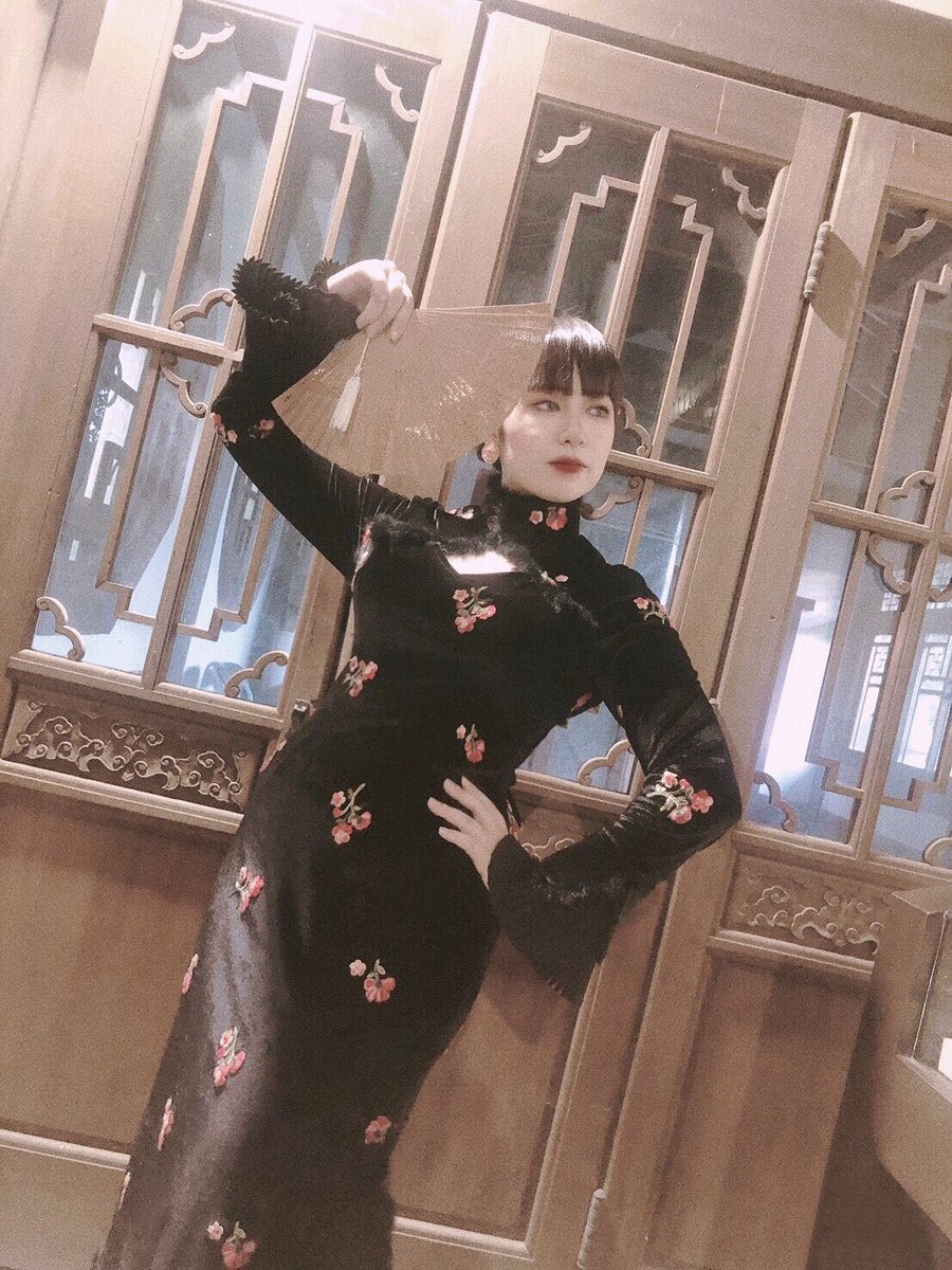 8 37 今日はこれでした。ヒルトン東京の中華ヌン茶ランチに合わせて黒モコ旗袍。 21/10/10 23:07