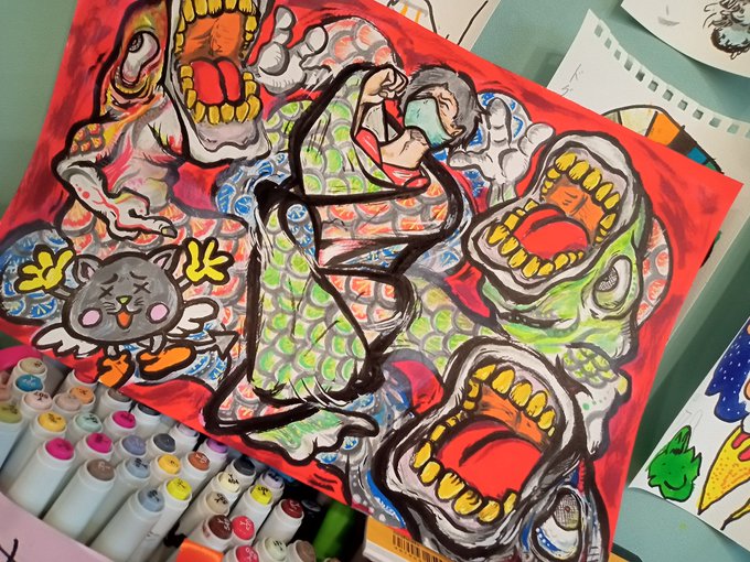 2 14 昔かいた絵をご紹介! 『無殺』 普段人間が食べている生き物。 人間は生きるためだけに食べているのか。これがもし人間だったら? という作品。 命をいただいて生きていること忘れずにいたいです。 いただきます。ご馳走さま。 たくさん食べたらうんちしよう! #イラスト #絵描き #ペン画 #食べ物 20/04/21 17:08