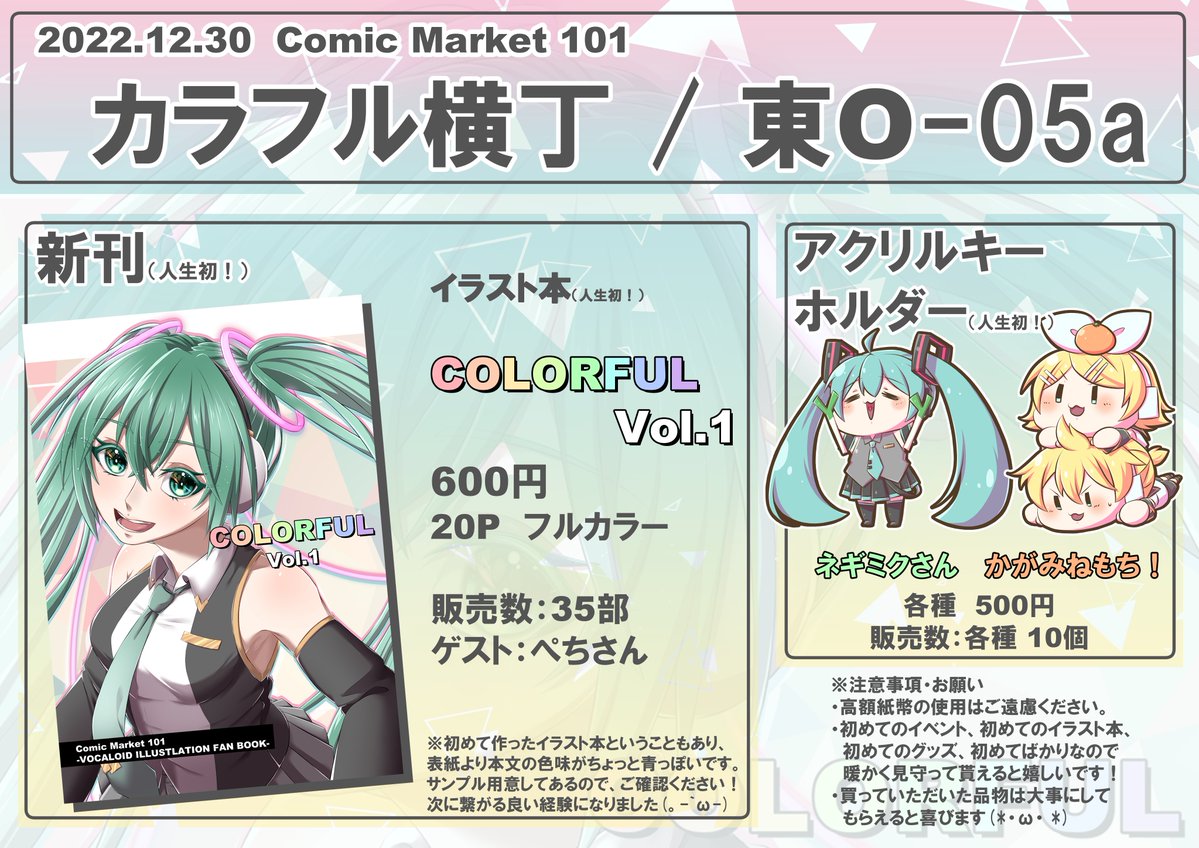 ✨C101 頒布物情報✨ ・フルカラーイラスト本「COLORFUL」 価格:600円 販売数:30冊予定 ・ネギミクさんアクリルキーホルダー 価格:500円 販売数:10個予定 ・かがみねもち!アクリルキーホルダー 価格:500円 販売数:10個予定 #C101WebCatalog #C101新刊 #初音ミク webcatalog-free.circle.ms/m/Circle/16813…