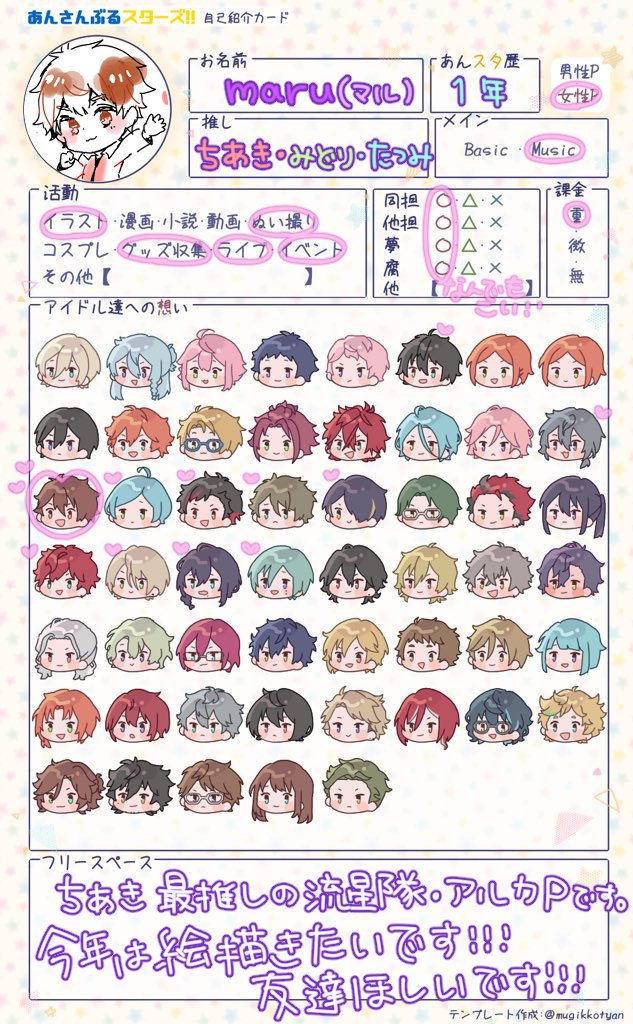 素敵なテンプレお借りしました! 千秋最推しの流星隊Pです!⭐ まだまだ新参者なのですがこれからあんスタ絵をたくさん描く予定です…!! グッズ交換等も流すと思いますがお許しいただける方で、RTいいねからお迎えに行きます…!! #あんスタ絵描きさんと繋がりたい #あんスタ好きさんと繋がりたい
