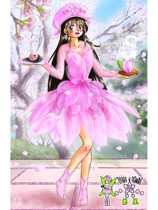 [ #桜餅 の妖精のお店-SAKURA茶屋🍵(架空)]のお店のイメージですが、それらしくロゴを付けたバージョンも載せてみます。 今回 #コンカフェ桜イラコン に、今年見に行ったダム湖湖畔の桜写真が役に立ちました!🌸 素敵な企画を有り難うございました。 宜しくお願いします。 #聖地でバイト