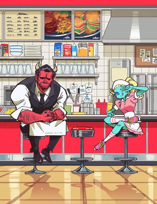 4 21 Boy&Girl展での新規絵ダイナー2名は、大昔描いたイラストの脇役リメイクでした。腕毛描くのが楽しかったです。 22/08/20 23:31