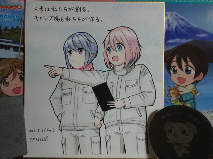 53 412 建設業ポスターのような構図で描いてみた。あおりって普段描かないからムズくて時間掛かった…。今日は山田屋旅館のフロントの冷蔵庫の上に飾らせてもらってるよん #ゆるキャンΔ #yurucamp_anime 22/05/06 20:41