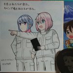 建設業ポスターのような構図で描いてみた。あおりって普段描かないからムズくて時間掛かった…。今日は山田屋旅館のフロントの冷蔵庫の上に飾らせてもらってるよん #ゆるキャンΔ #yurucamp_anime