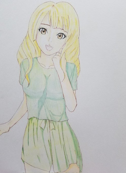 #一次創作 #冬の創作クラスタフォロー祭り #イラスト #アナログイラスト #イラスト好きな人と繋がりたい #絵描きさんと繋がりたい 部屋着の金髪おにゃのこ💕 影が難しい~💦 服によって影が違うからもっと勉強しないと全部Tシャツになってしまう😅w でも身体は少しずつ良くなってきてるので楽しい🍀