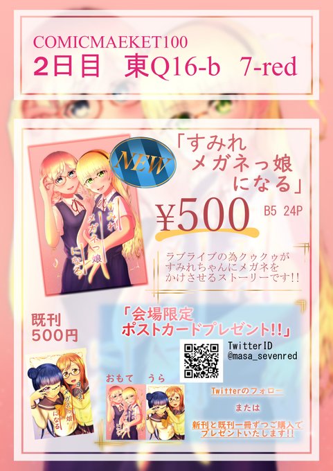 あなたのサークル「7-red」は、コミックマーケット100で「日曜日東地区 "Q " 16b」に配置されました!コミケWebカタログにてスペース配置場所公開中です! webcatalog.circle.ms/Circle/Map/162… #C100WebCatalog 当選しました! 今回の内容もなんやかんやあって眼鏡かけさせます #夏コミ #C100 #平安名すみれ