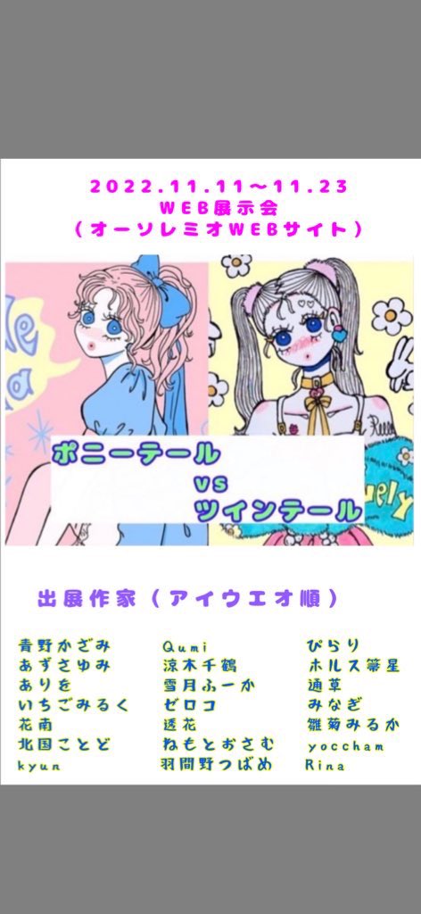 #イラストレーターさんと繋がりたい #ポニツイ展 《出展者さま募集》 次回のWEB展示会&販売会は「ポニーテールvsツインテール」です。 どちらの髪型でも両方の髪型でも構わないです。 キュートな作品お待ちしております。 出展料無料、作品2点まで。 展示のみ不可。 お気軽にお声かけしてください。