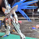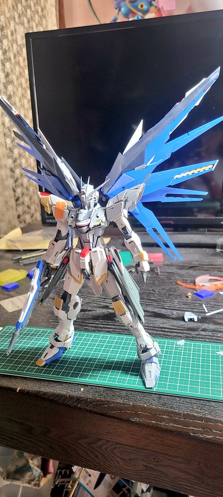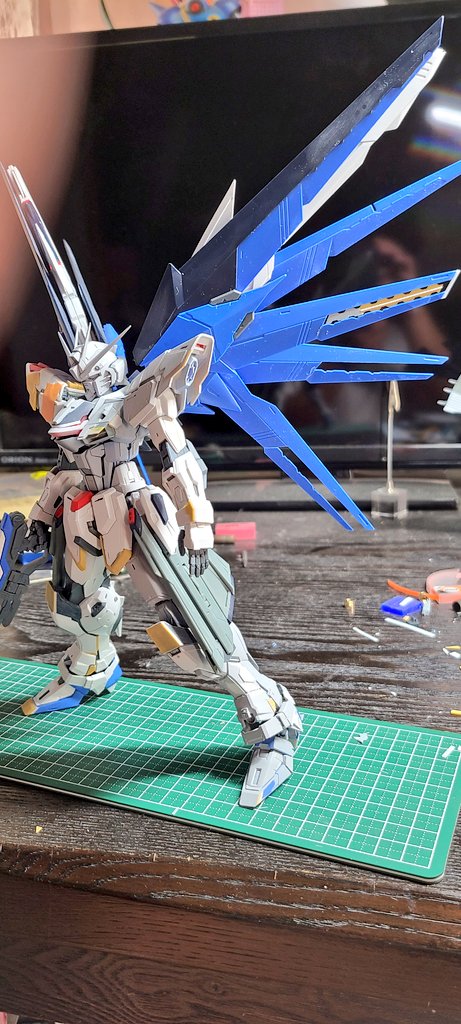 フリーダム進捗 翼はこんな感じで空間使っていこうかなぁ〜 脚も結局ヒールにしました! この脚の構造ならヒールやり易いしね♪ てか、フリーダム自立するんだねw #ガンプラはどんな自由な発想で作ってもいいんだ