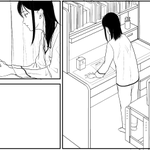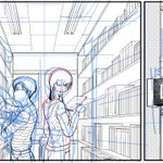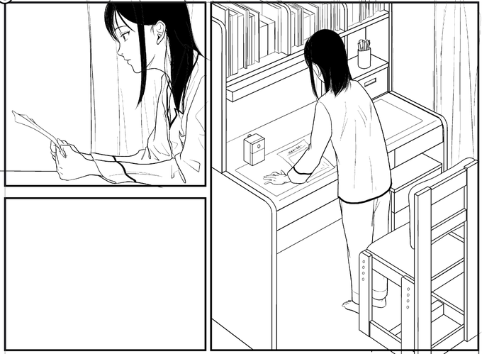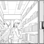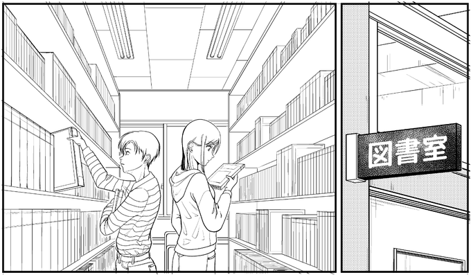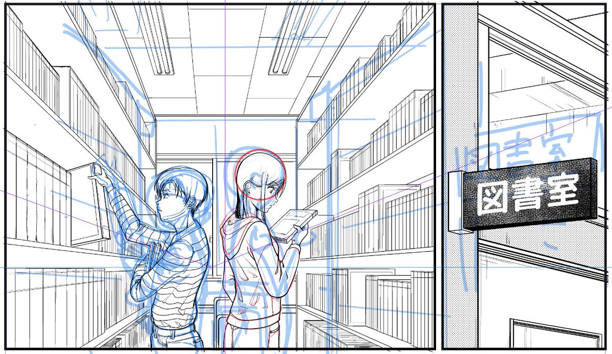 図書室とか・・ めんどくさすぎるやろ~🤣 本の縦線は一部分トーンの縦線を使っています 典型的な1点透視図法です アイレベルは胸の下辺り ラフと比べてパースが全然違いますね #漫画家志望さんと繋がりたい