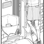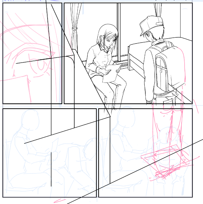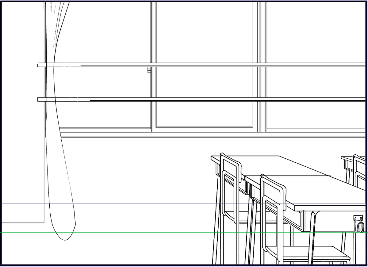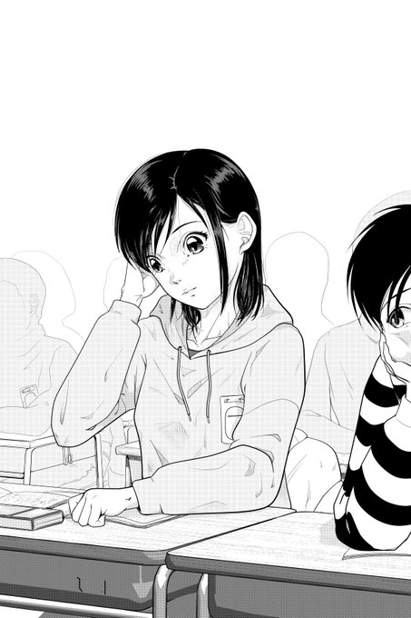 机は3D素材を使おうとしましたが、 人物とパースが合わなくてイライラしたので 自分で描きました(;´・ω・) 椅子は奥のをコピペしました。 1点透視図法、アイレベルは、 女子の下瞼の辺りです。 マスク使いまくります💦 #漫画家志望さんと繋がりたい
