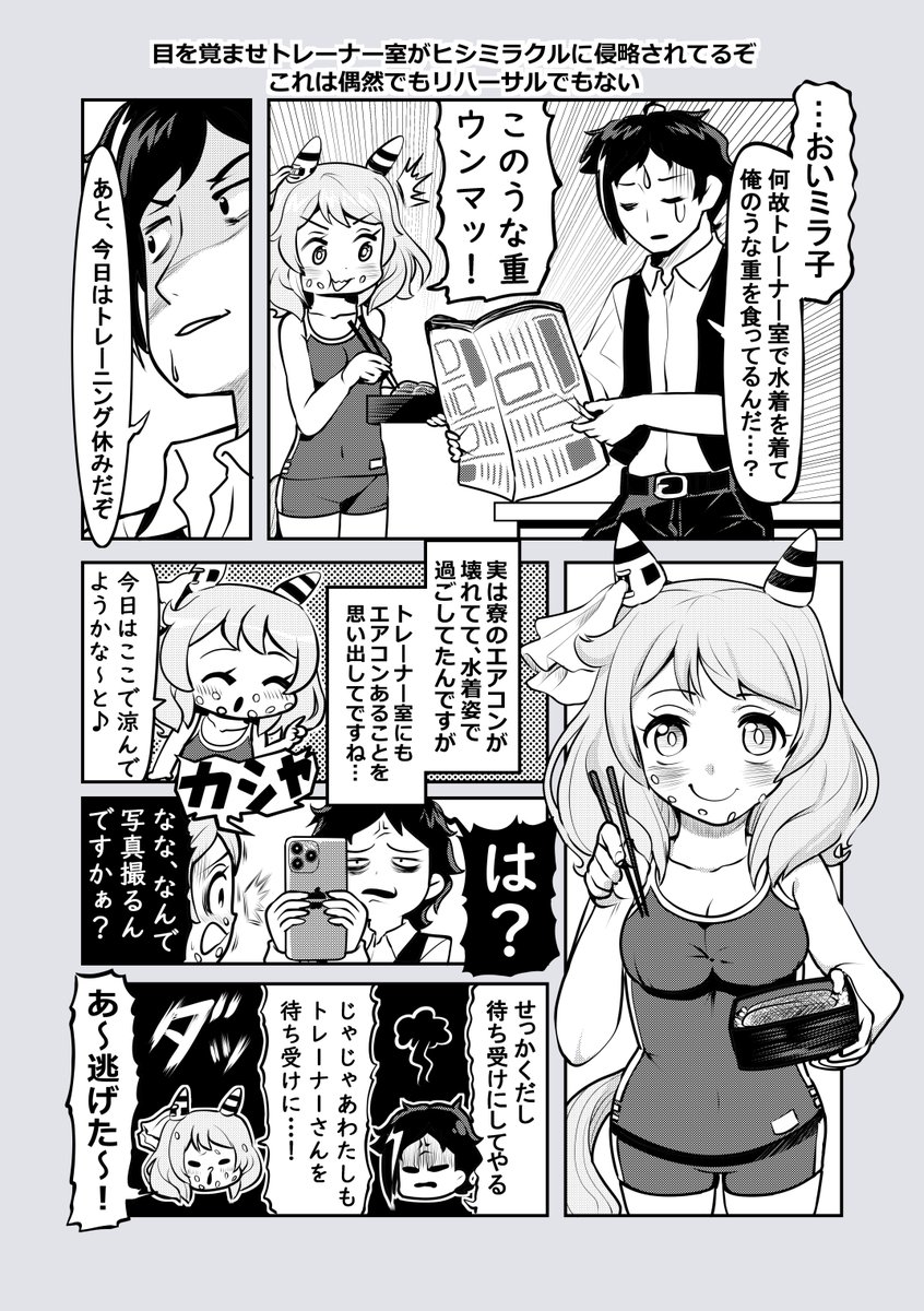 ウマ娘四コマ「ウマさんぽ2023夏~ミラ子を添えて~」#ウマ娘 #ヒシミラクル