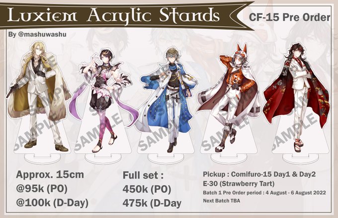 Hello! I'll be selling Luxiem acrylic Standees on CF15 Indonesia. Pickup on booth E-30 (Day1 & Day2) Price : @ IDR 95k 450k (full set) Height : approx. 15 cm Order : forms.gle/7TUVgTVbJGoCdx… #NIJISANJI #comifuro15 #CF15 #Luxiem #drawluca #ikenography #yaminoart #mystart #akurylic