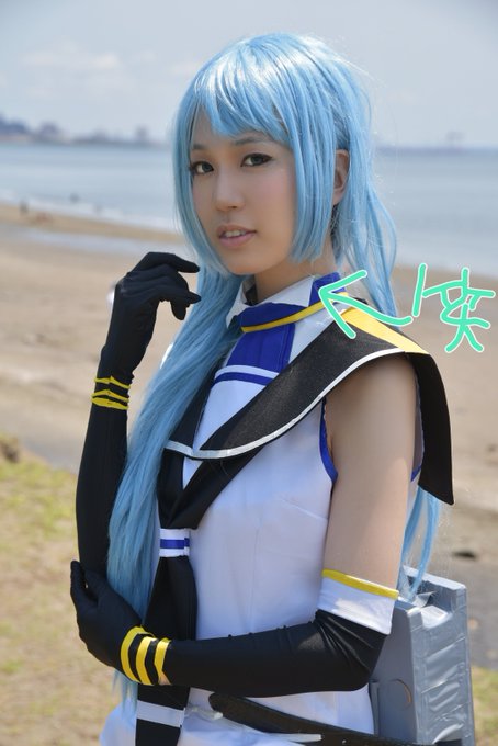 艦これの五月雨コスの海ロケの際に、インナーの襟付きシャツを忘れて、近くのファミリーマートでチケット保管用の封筒をもらって急いで襟を作りました(^q^)ww アップにしたら裏側の緑っぽいのがわかる((( 良い思い出です(笑) #コスプレイヤー代用選手権 photo@キニョ様(@kinyoi)