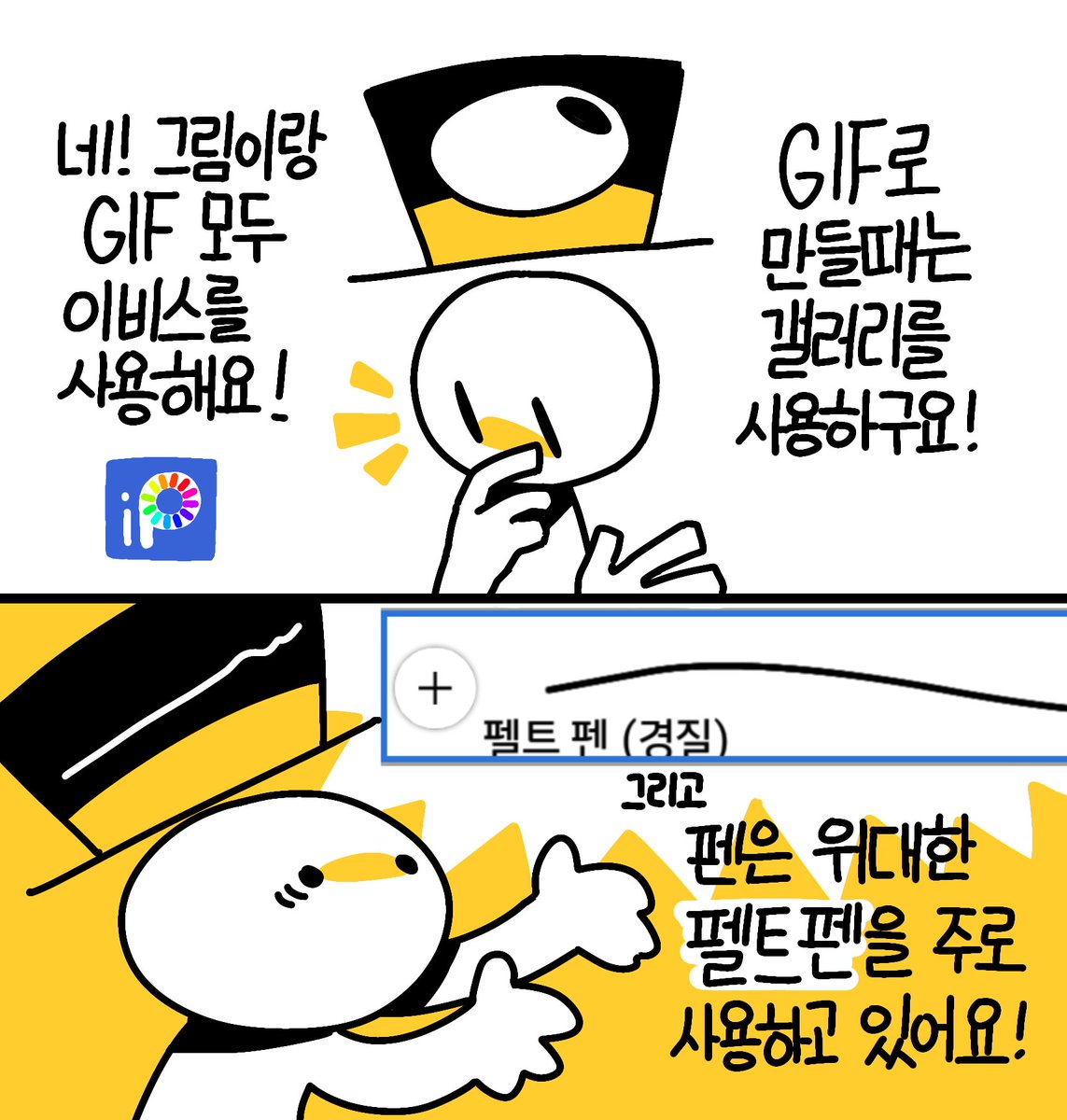질문 답변 만화! - 그림은 무슨 프로그램으로 그리시나요? GIF만들때도 같은 프로그램을 사용하나요? - 그림 그리실때 무슨 펜 쓰시나요?
