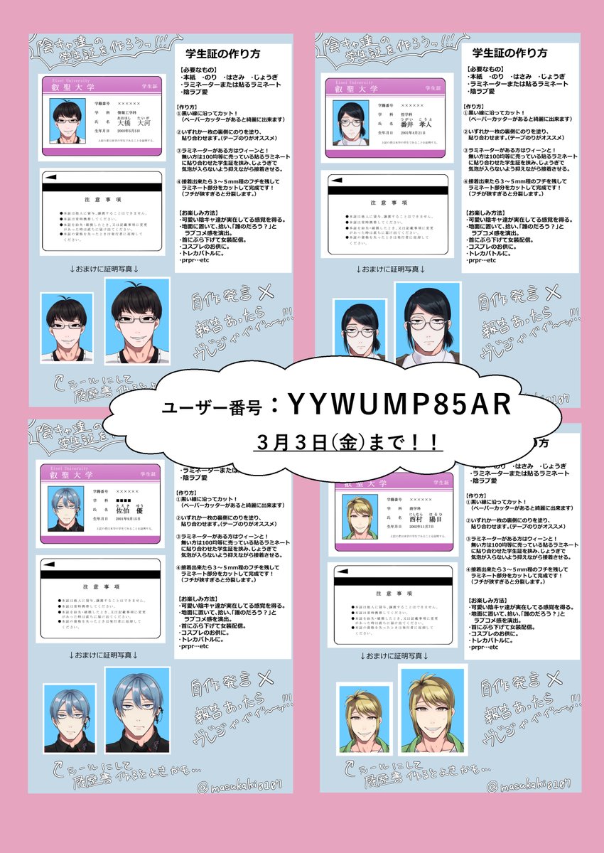 #陰ラブFA 陰キャ達の学生証をネップリ配布します! 学生証の作り方は本紙に記載しておりますのでご参考に! ユーザー番号【YYWUMP85AR】 期限は3月3日(金)まで! 番号を入力すると4人の陰キャ達が表示されるので選択し、【フルカラー】【B5】で印刷お願い致します。 ローソンかファミマにGO!